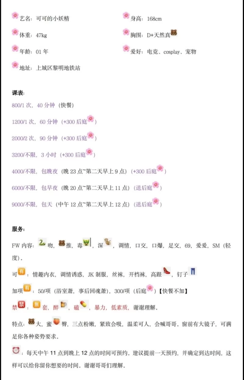 服务项目: 舌吻,胸推,毒龙,深喉,调情,口交,口爆,足交,69丝袜,爱爱,sm轻度,情趣诱惑,丝袜制服,高跟鞋,加项50项浴室萧,事后回魂萧,300项,后庭快餐不加,